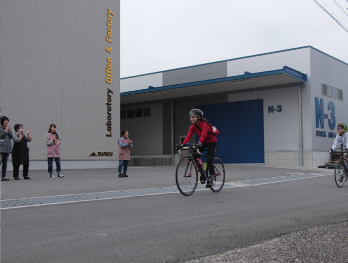 おかえりなさ~い!ミシンや機械で作業をしている社員みんなでお出迎えをしました^^