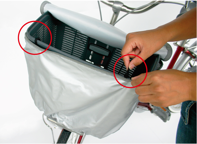 カバーをカゴに被せ、2か所の紐を結び固定します。