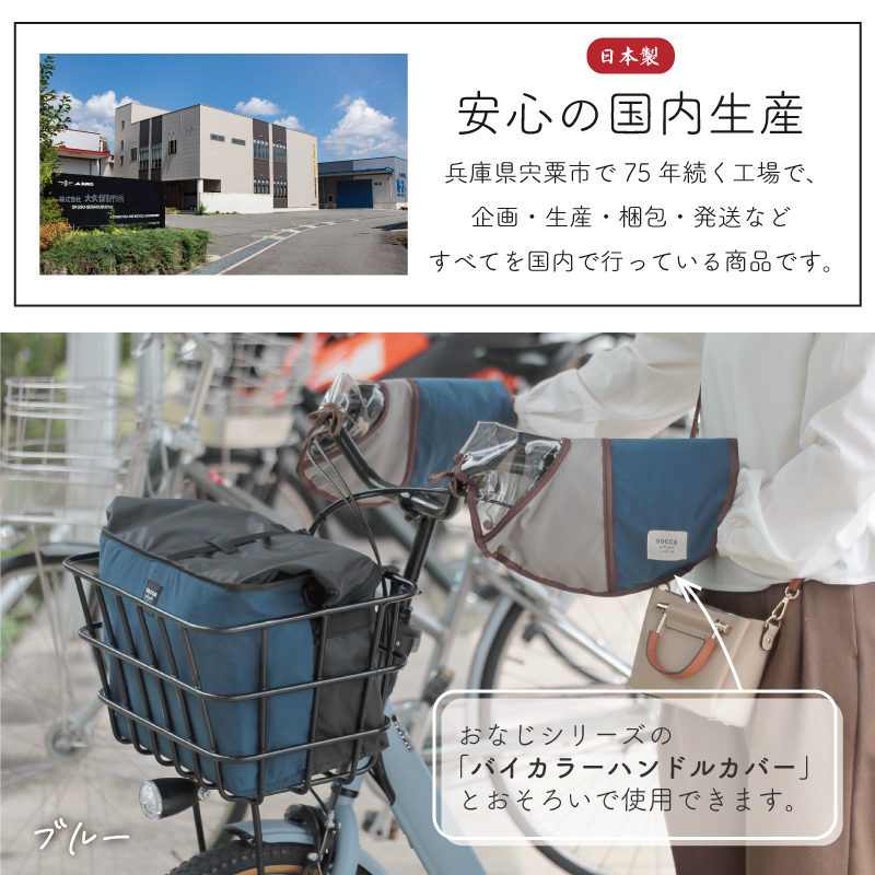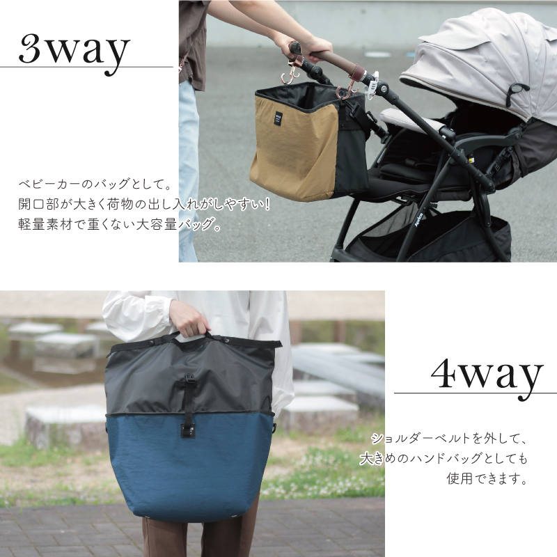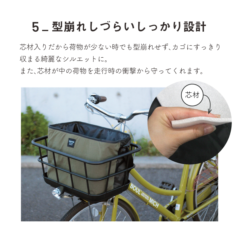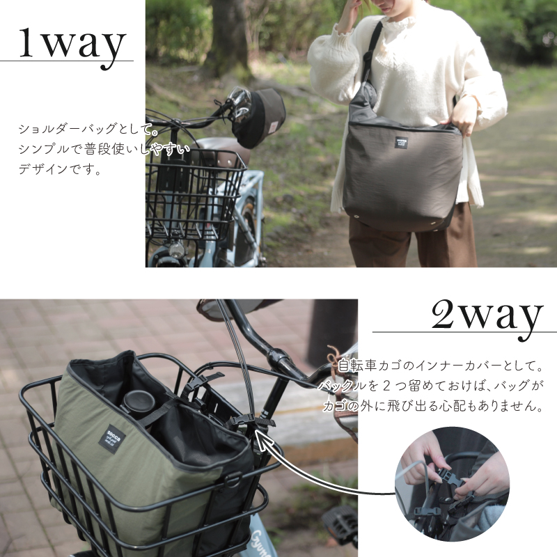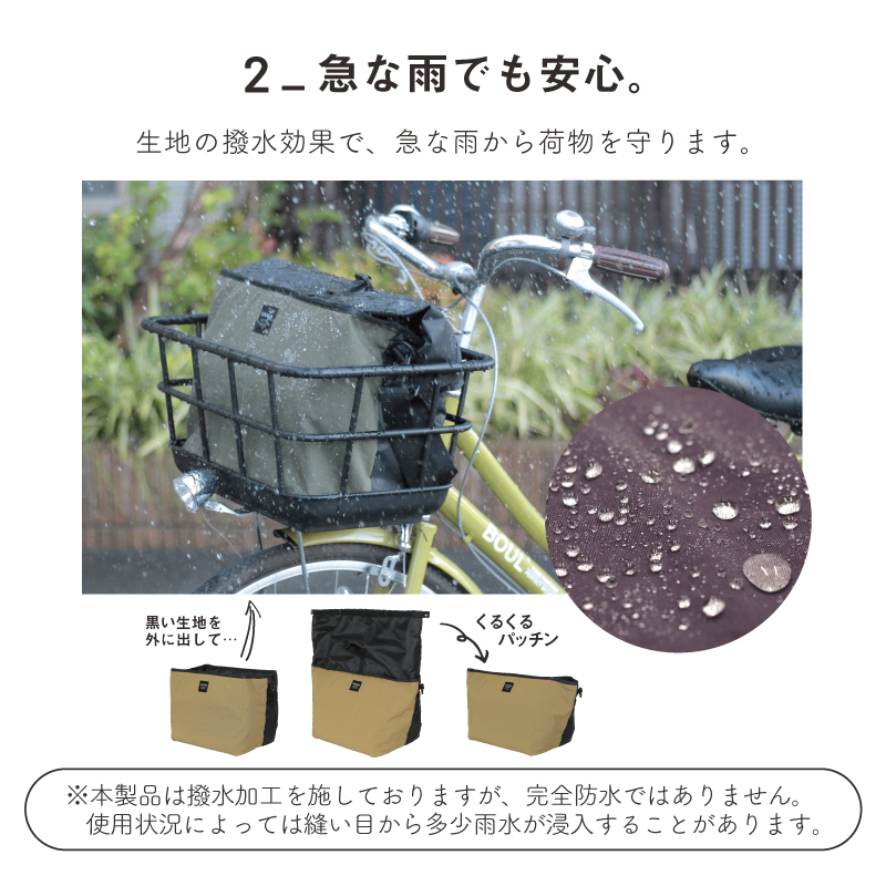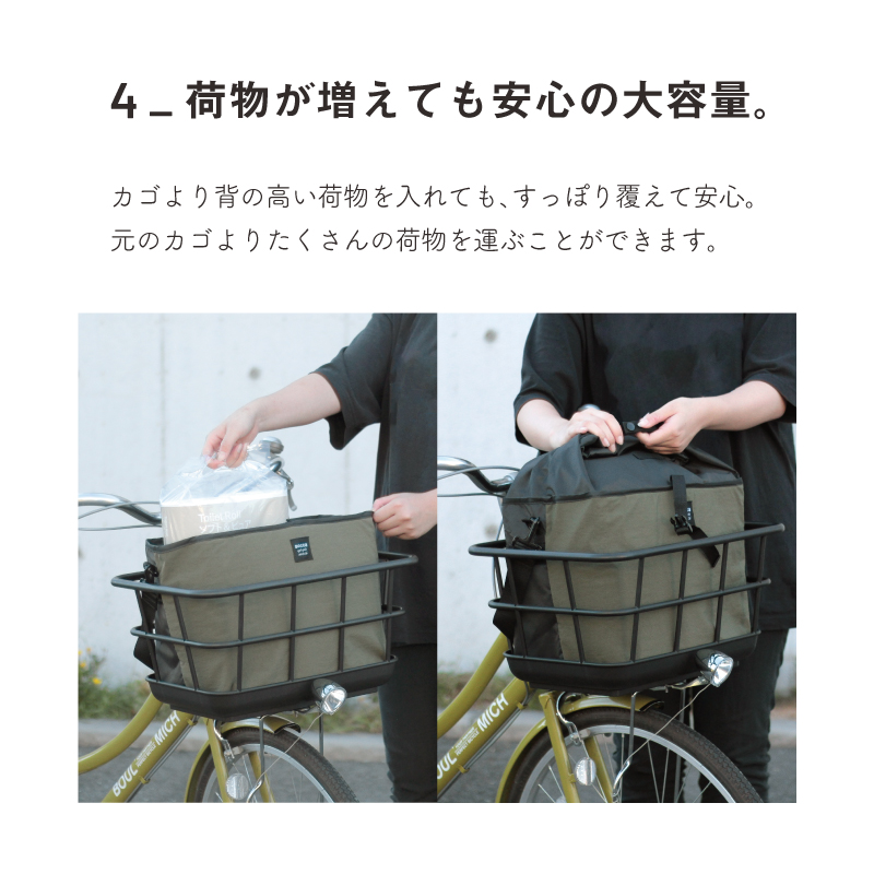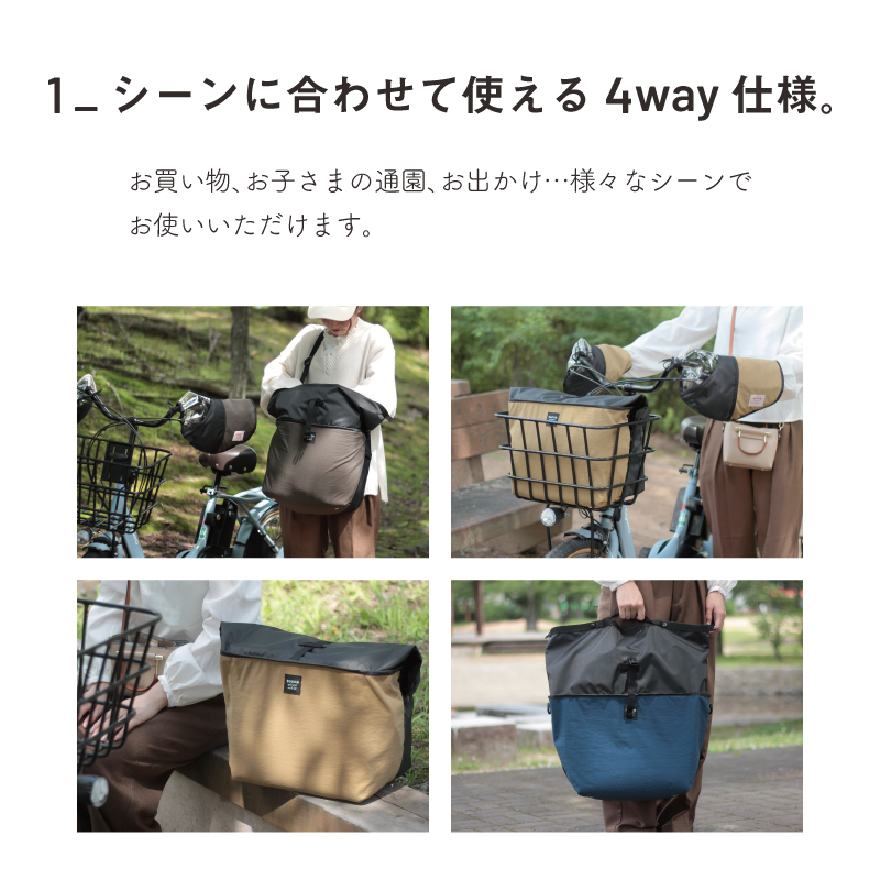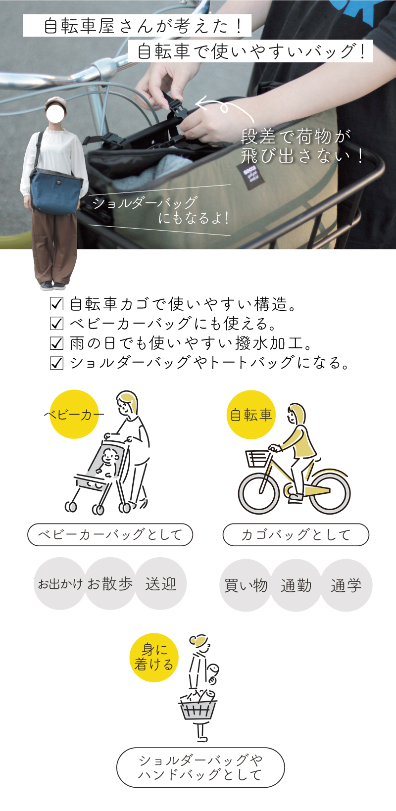 | 商品の特徴 | ◇シーンに合わせて使える4way仕様。 ◇ショルダーバッグとしても、ベビーカーバッグ、自転車カゴのインナーカバーとしても使用できます。 ◇カゴからバッグが飛び出るのを防ぐバックル付き。 ◇荷物がすっぽり覆えて大容量! ◇ショルダーベルトを外せばハンドバッグにも。 ◇生地の撥水効果で荷物の雨除けにも◎。 ◇芯材入りで型崩れしづらい。 ◇中の荷物を走行中の衝撃から守ります。 ◇浅型のカゴにも取り付けができます。 ◇便利な内ポケット付き。 ◇万が一中に雨水が入っても、水抜き穴があるから中に水が溜まりにくい。 ◇調節可能、取り外し可能なショルダーベルト。 ◇シックなデザインで男性も使いやすい。 ◇豊富なカラーバリエーション。 ◇おなじシリーズの「バイカラーハンドルカバー」とおそろいでコーディネートできます。 |