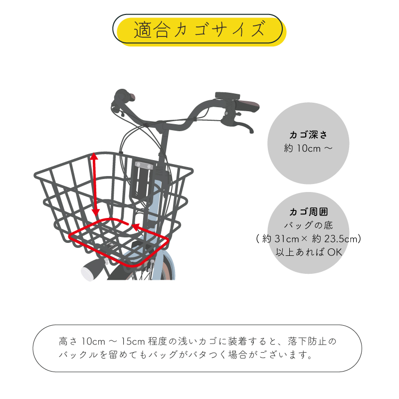 | 適合機種 | カゴ深さ 約10cm以上 カゴ周囲 バッグの底(約31cm×約23.5cm)と同等以上 |