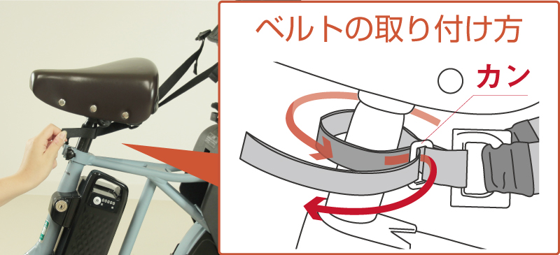 両側のベルトの長さを調節します。ベルトを強く締めすぎないでください。カバーの変形の原因となります。