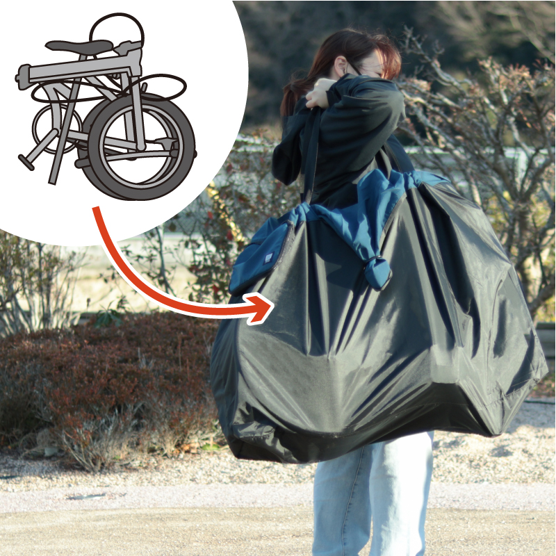 自転車を折り畳んだら、あとは袋に入れて持ち上げるだけ!誰でも簡単に収納できます。