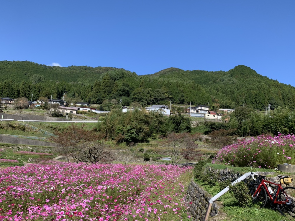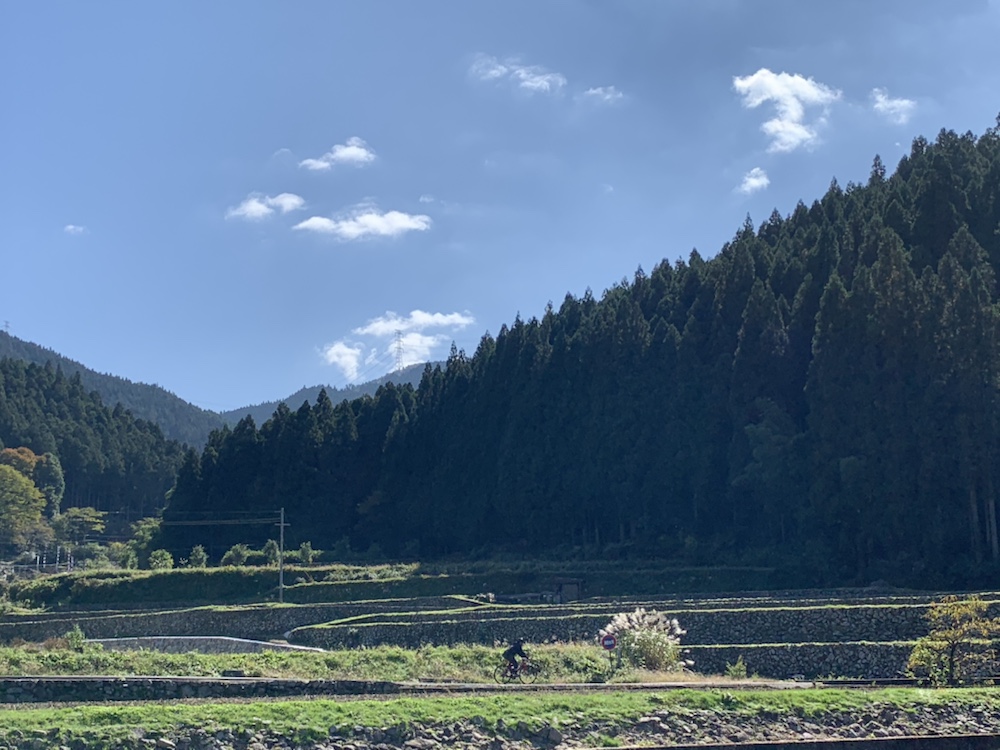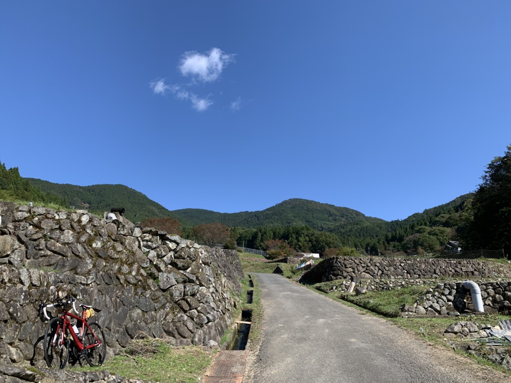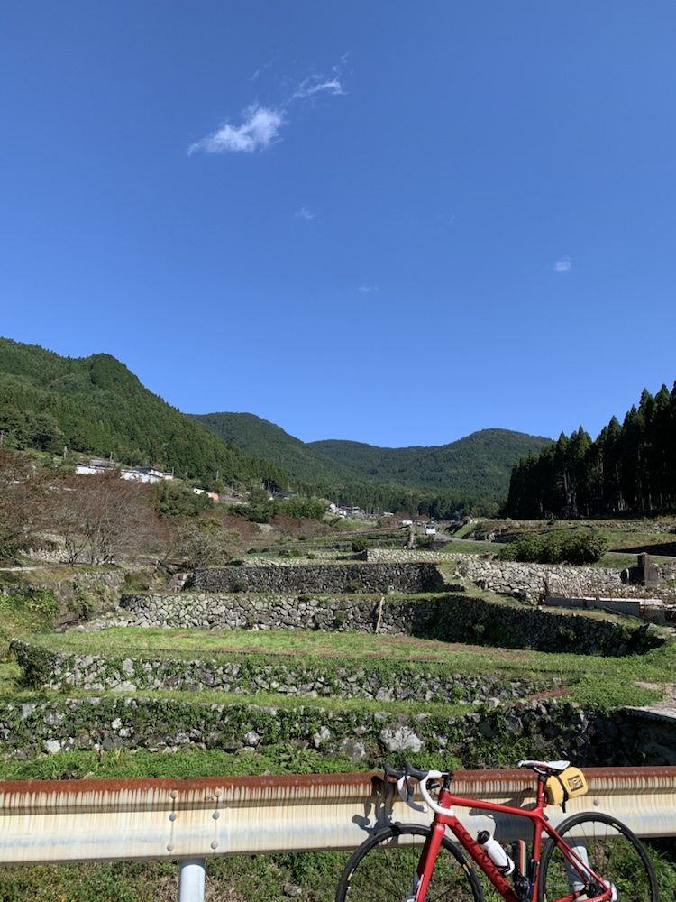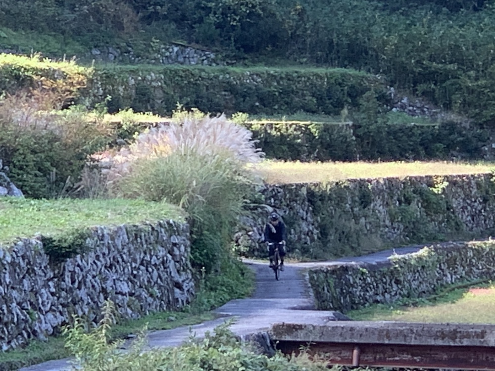 庭田神社から、登りをコギコギ。石積みの綺麗な、棚田の風景に出会えます。
