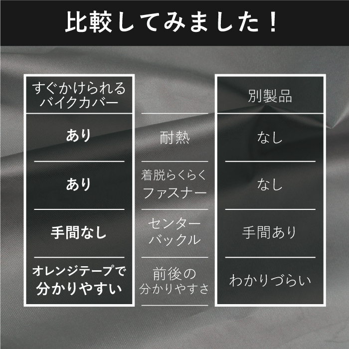 従来のカバーはクシャクシャに置いた状態だと、カバーの前後が分からずわざわざ広げる必要が…。このバイクカバーならシルバーの生地から見えやすいオレンジの持ち手とファスナーで、カバーを広げる必要なし!一目で前後が分かります。