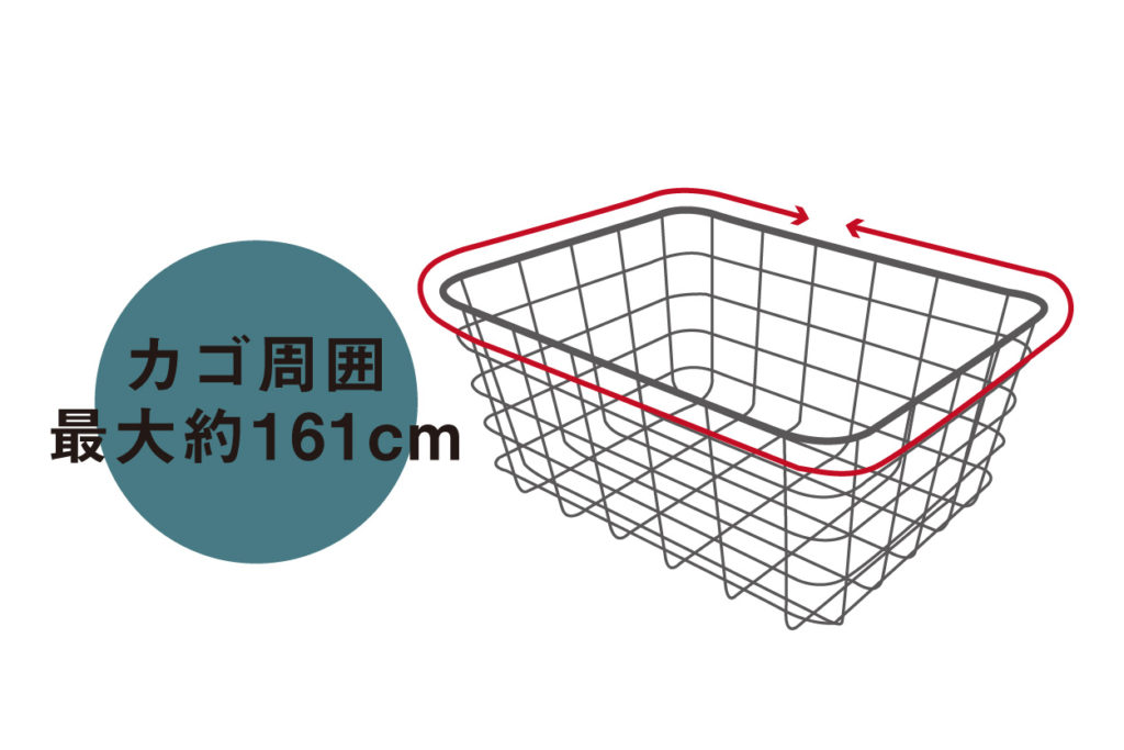 | 適応カゴサイズ | 周囲136~161cm程度 大小兼用 一般カゴ(23ℓ)~超ビッグ後カゴ(34ℓ) |