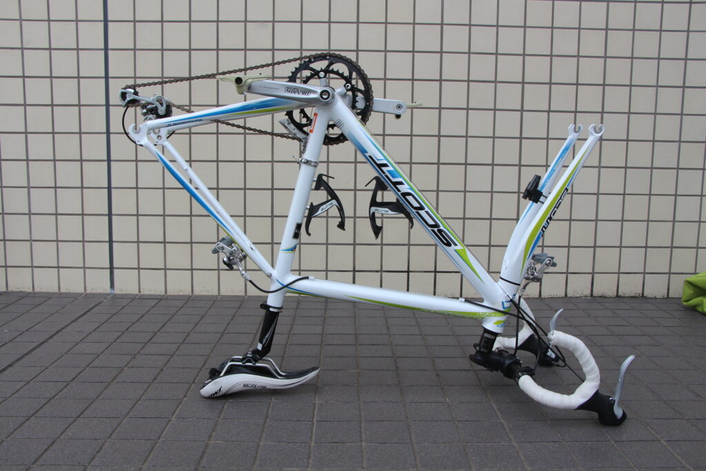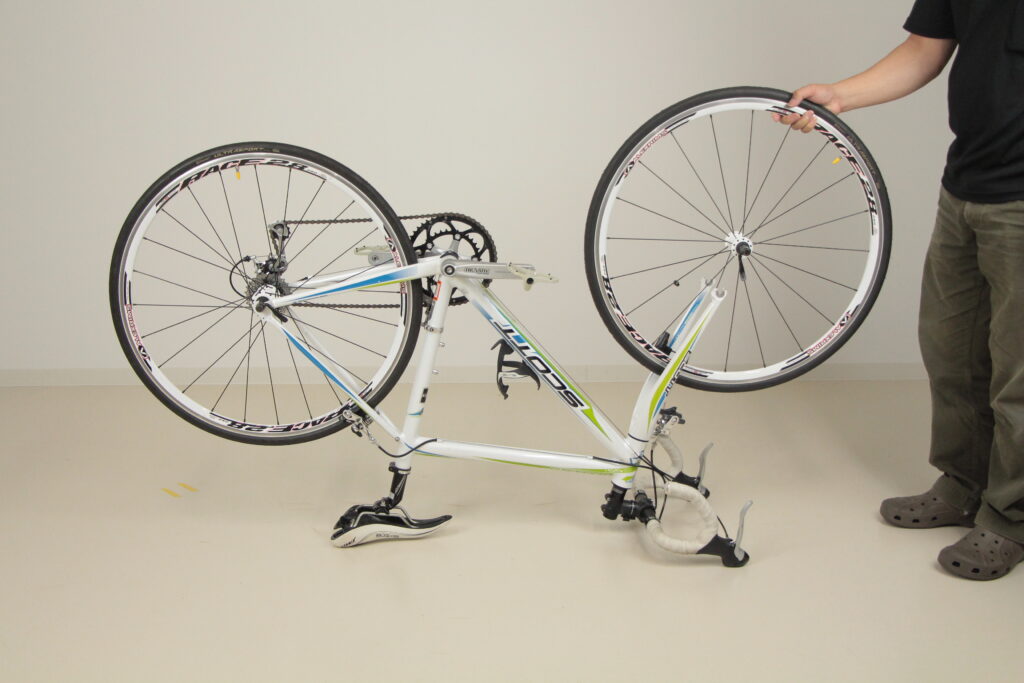 シートチューブとFフォークを持ってひっくり返し、ハンドルとサドルを地面につけて安定させる。