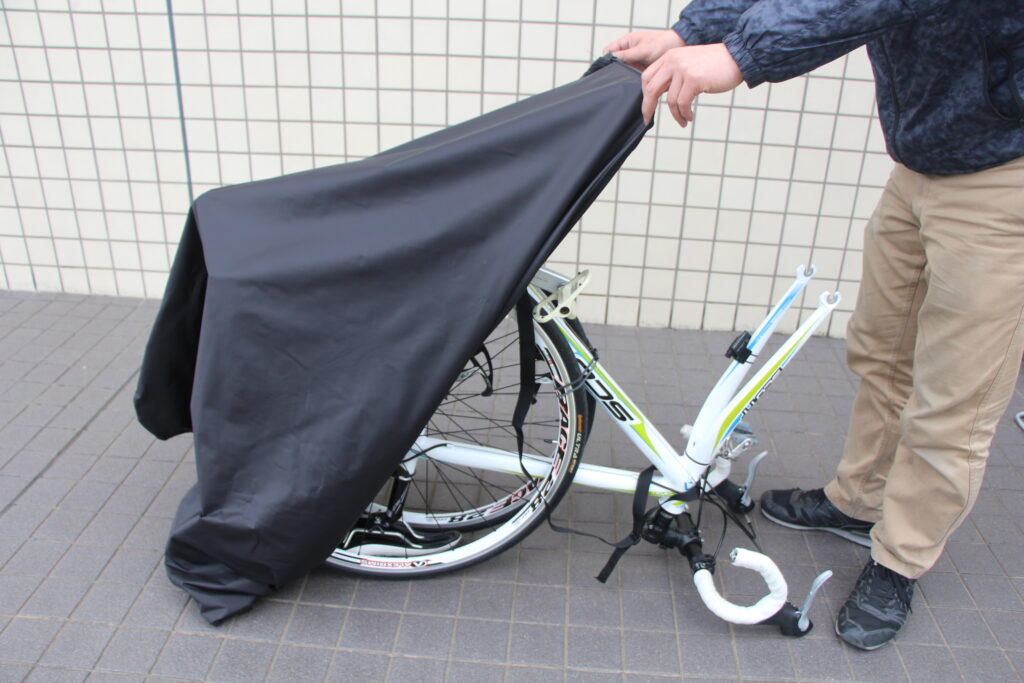 ファスナーを全開にし、カバーを自転車後方より前方におおいかぶせ、サドルが隠れるようにカバースソを整え、ハンドルを切ります。