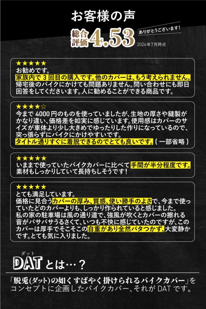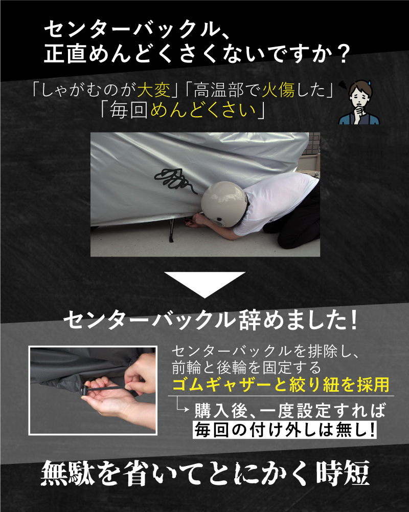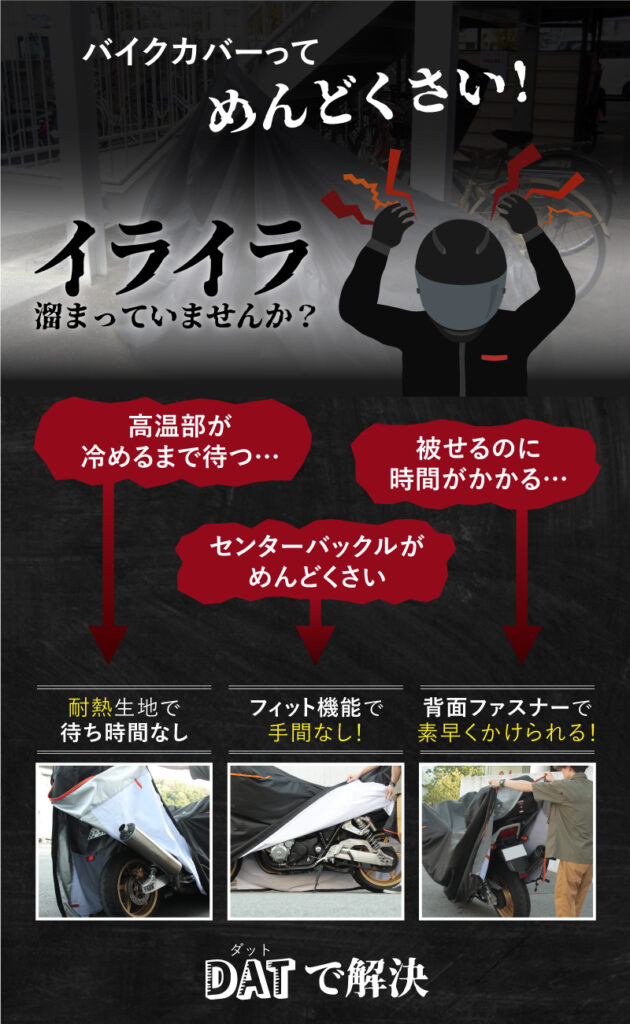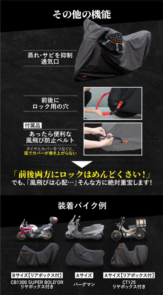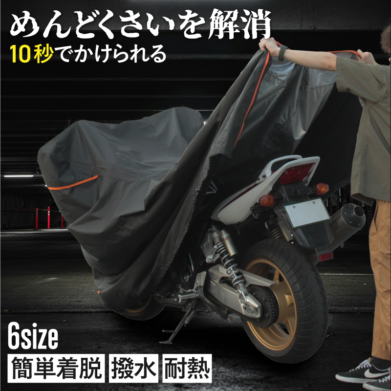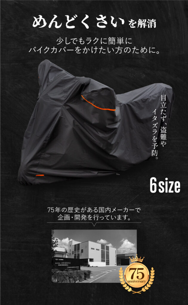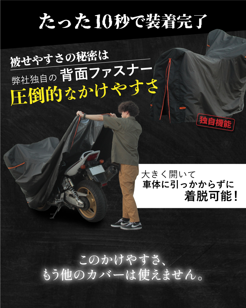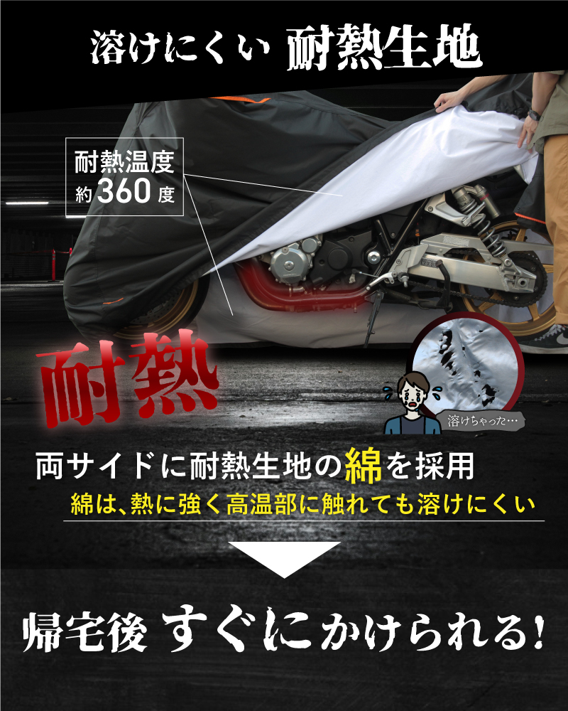 | 商品の特徴 | ◇たったの10秒でバイクカバーがかけられる。 ◇色落ちしにくい先染めの黒生地を使用。 ◇オレンジのベンチレーション(通気口)とファスナーでカバーの前後が分かりやすい。 ◇カバー内側に耐熱温度約360℃の溶けにくい綿素材を使用。エンジンを冷ます時間を待たなくてもいい! |