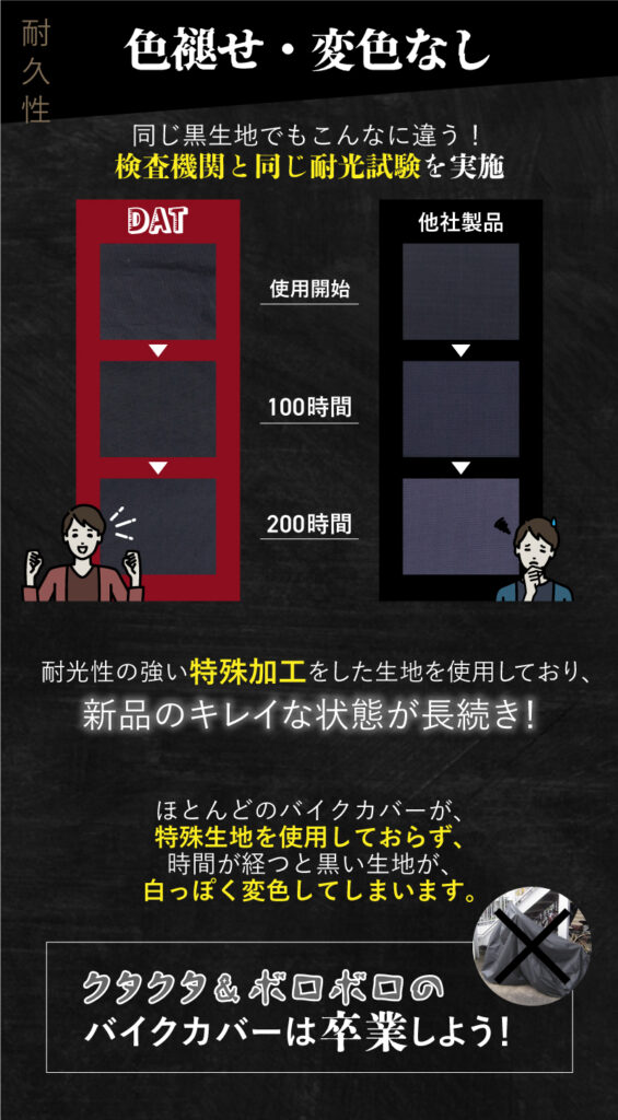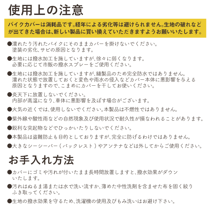 | 注意 | ●バイクカバーは消耗品です。経年による劣化等は避けられません。生地の破れなどが出てきた場合は、新しい製品に買い換えていただきますようお願いいたします。 ●本製品は盗難防止も目的としておりますが、完全に防げるわけではありません。 ●紫外線や酸性雨などの自然現象及び使用状況で耐久性が損なわれることがあります。 ●鋭利な突起物などでひっかいたりしないでください。 ●炎天下に放置しないでください。内部が高温になり、車体に悪影響を及ぼす場合がございます。 ●火気の近くでは、ご使用しないでください。本製品は不燃性ではありません。 ●生地には撥水加工を施していますが、徐々に弱くなります。必要に応じて市販の撥水スプレーをご使用ください。 ●生地には撥水加工を施していますが、縫製品のため完全防水ではありません。濡れた状態で放置しておくと変色や雨水の侵入などカバー本体に悪影響を与える原因となりますので、こまめにカバーを干してお使いください。 ●濡れたり汚れたバイクにそのままカバーを掛けないでください。塗装の劣化、サビの原因となります。 ●大きなシーシーバー(バックレスト)やアンテナなどは外してからご使用ください。 |