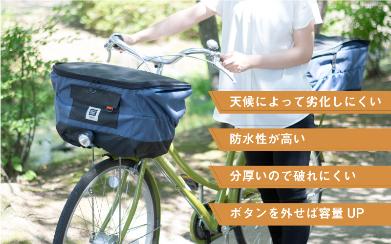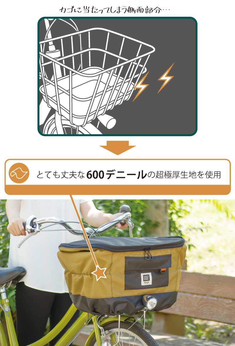 | 商品の特徴 | ・シンプルで使いやすいカゴカバー ・ボタンを外して容量+20cmUP ・破れにくい丈夫さを追求した600デニールの超極厚生地 ・カバーサイドのゴムで幅広いカゴに適合 ・指をかけやすいファスナー ・カバー前面に小物などを入れられるポケット ・雨の日でもしっかり撥水 |