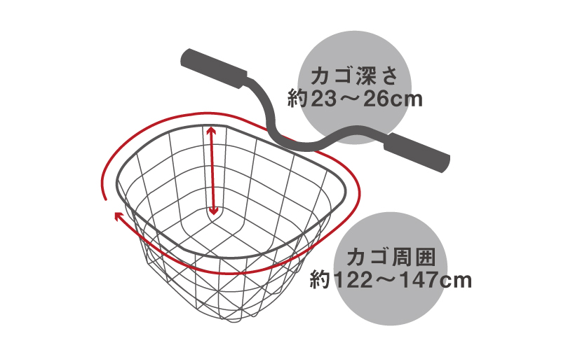 | 適応カゴサイズ | ◆前カゴ専用 電動アシスト車のワイドカゴにも対応(一般的な前カゴに対応) カゴ周囲122~147㎝以内のカゴ ※新聞カゴなどの特殊カゴには適合しておりません。 |