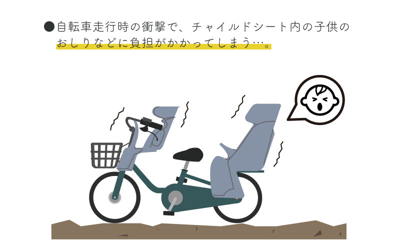 段差やでこぼこ道などを走った時のお子さまへの衝撃をクッションが吸収、緩和させてくれます。